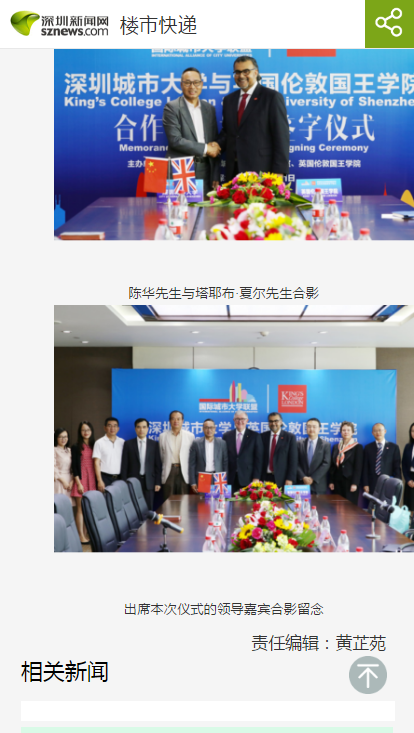 2017年5月11日上午,深圳城市大学与英国伦敦国王学院二度牵手,在京基100大厦A座72楼签订合作框架协议,约定未来双方的教育合作将实现全面化。这是继去年12月份双方就深圳城市大学下属的“大健康学院”和“物联网学院”项目签署相关合作协议后的再次携手。