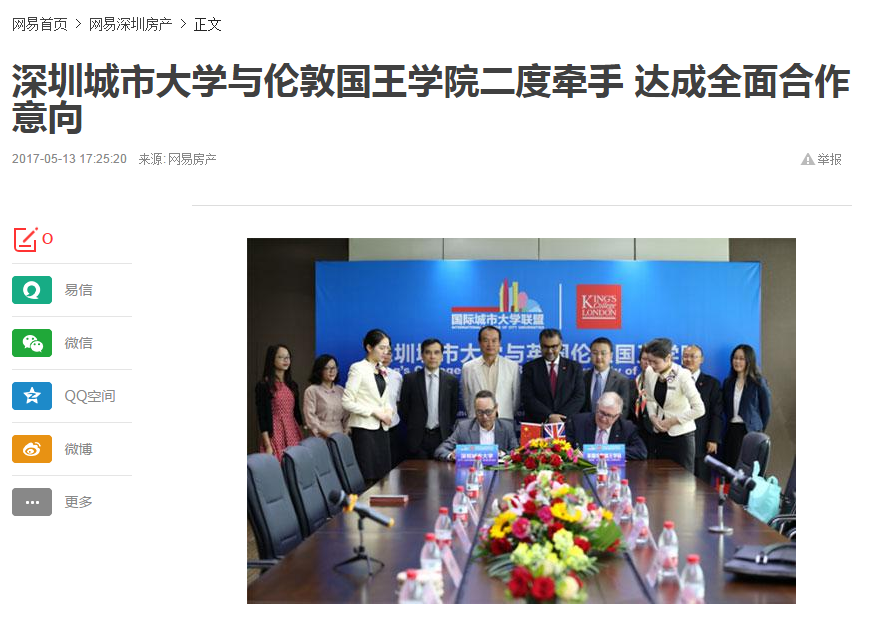 2017年5月11日上午,深圳城市大学与英国伦敦国王学院二度牵手,在京基100大厦A座72楼签订合作框架协议,约定未来双方的教育合作将实现全面化。这是继去年12月份双方就深圳城市大学下属的“大健康学院”和“物联网学院”项目签署相关合作协议后的再次携手。