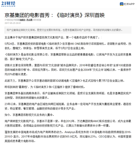 京基集团常务副总裁熊伟表示,将产业触角延伸到文化领域,是受行业发展形势所驱,也是京基集团实现产业转型、寻找新的利润增长点的需求。