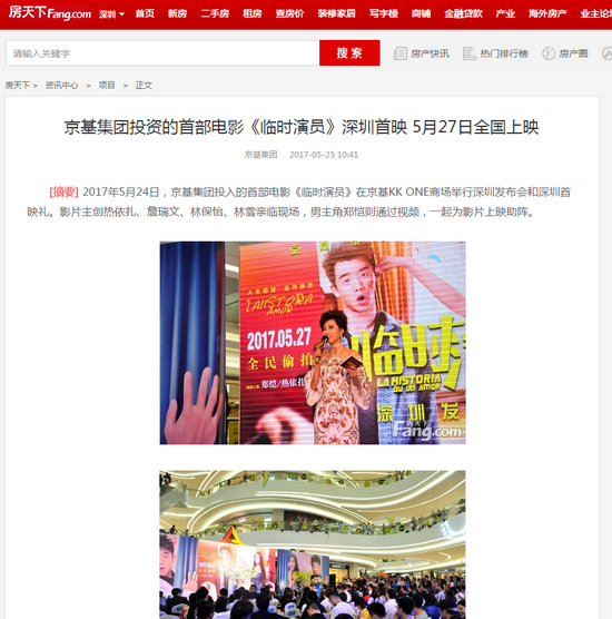 2017年5月24日,京基集团投入的首部电影《临时演员》在京基KK ONE商场举行深圳发布会和深圳首映礼。影片主创热依扎、詹瑞文、林保怡、林雪亲临现场,男主角郑恺则通过视频,一起为影片上映助阵。