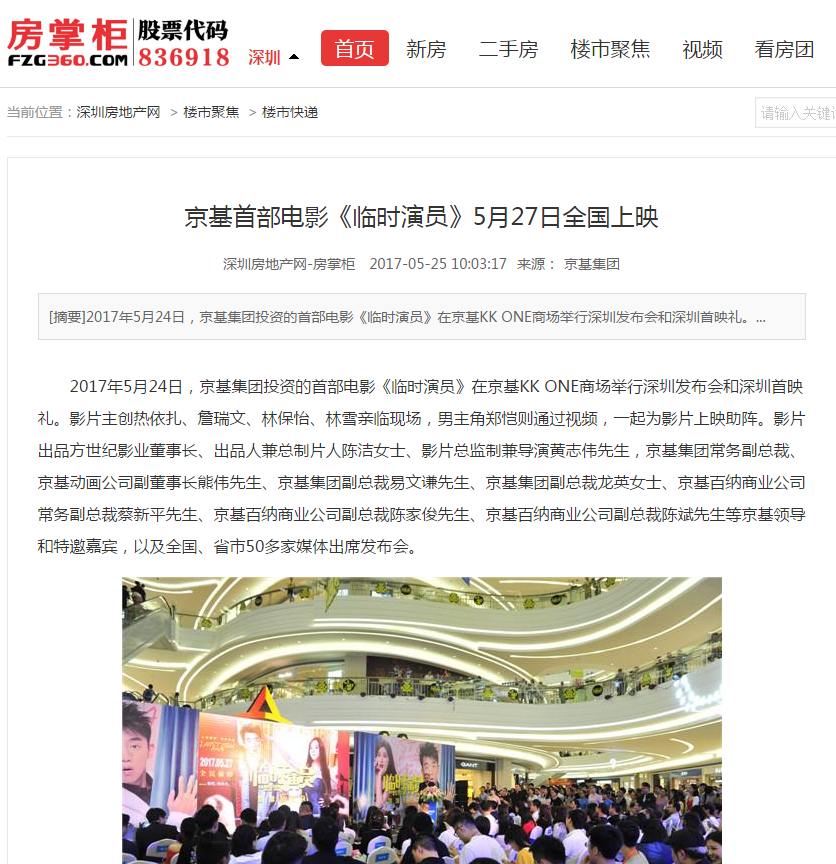 2017年5月24日,京基集团投资的首部电影《临时演员》在京基KK ONE商场举行深圳发布会和深圳首映礼。影片主创热依扎、詹瑞文、林保怡、林雪亲临现场,男主角郑恺则通过视频,一起为影片上映助阵。影片出品方世纪影业董事长、出品人兼总制片人陈洁女士、影片总监制兼导演黄志伟先生,京基集团常务副总裁、京基动画公司副董事长熊伟先生、京基集团副总裁易文谦先生、京基集团副总裁龙英女士、京基百纳商业公司常务副总裁蔡新平先生、京基百纳商业公司副总裁陈家俊先生、京基百纳商业公司副总裁陈斌先生等京基领导和特邀嘉宾,以及全国、省市50多家媒体出席发布会。