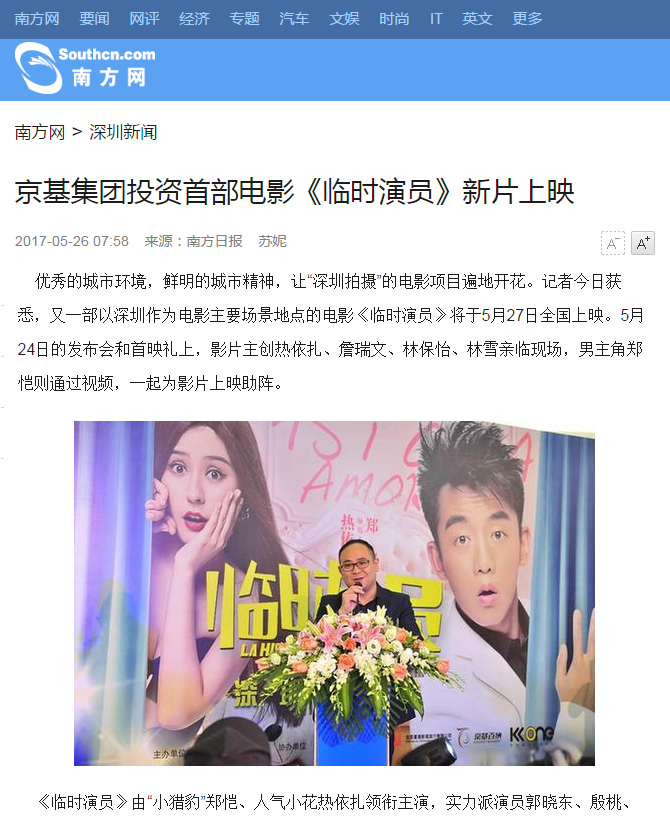 作为影片联合出品方代表、深圳发布会主办方,京基集团常务副总裁、京基动画公司副董事长熊伟在致辞中表示,国产电影的大好发展势头,影片主创团队的实力,电影题材的现实性与话题度,影片拍摄地位于深圳,是京基选择投拍《临时演员》的原因。