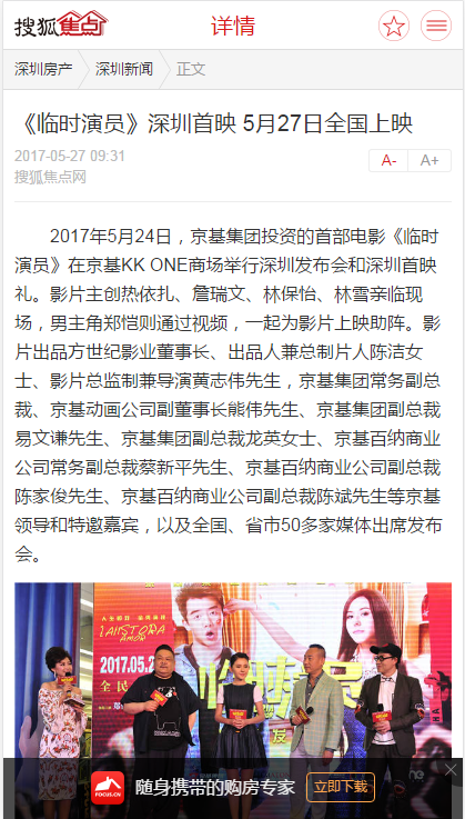 2017年5月24日,京基集团投资的首部电影《临时演员》在京基KK ONE商场举行深圳发布会和深圳首映礼。影片主创热依扎、詹瑞文、林保怡、林雪亲临现场,男主角郑恺则通过视频,一起为影片上映助阵。影片出品方世纪影业董事长、出品人兼总制片人陈洁女士、影片总监制兼导演黄志伟先生,京基集团常务副总裁、京基动画公司副董事长熊伟先生、京基集团副总裁易文谦先生、京基集团副总裁龙英女士、京基百纳商业公司常务副总裁蔡新平先生、京基百纳商业公司副总裁陈家俊先生、京基百纳商业公司副总裁陈斌先生等京基领导和特邀嘉宾,以及全国、省市50多家媒体出席发布会。