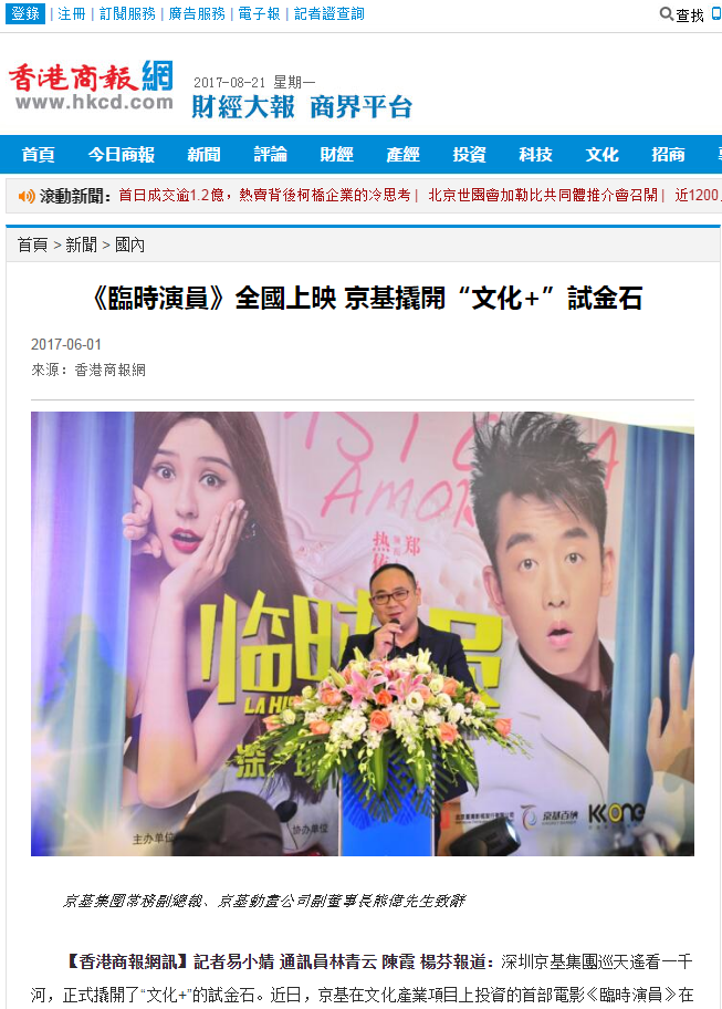 【香港商報網訊】記者易小婧通訊員林青云陳霞楊芬報道:深圳京基集團巡天遙看一千河,正式撬開了“文化+”的試金石。近日,京基在文化產業項目上投資的首部電影《臨時演員》在深圳濱河時代KKONE商場舉行了首映禮。在首映禮上,影片主創熱依紮、詹瑞文、林保怡、林雪親臨現場,男主角鄭愷通過視頻為影片上映助陣。影片出品方世紀影業董事長、出品人兼總制片人陳潔女士、影片總監制兼導演黃志偉先生,京基集團常務副總裁、京基動畫公司副董事長熊偉先生、副總裁易文謙先生、龍英女士、京基百納商業公司常務副總裁蔡新平先生、副總裁陳家俊先生、副總裁陳斌先生等出席了首映禮。