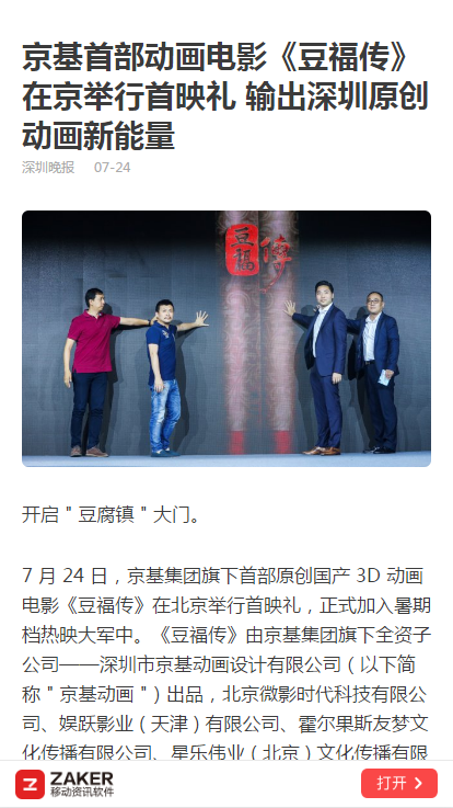 7 月 24 日,京基集团旗下首部原创国产 3D 动画电影《豆福传》在北京举行首映礼,正式加入暑期档热映大军中。《豆福传》由京基集团旗下全资子公司——深圳市京基动画设计有限公司(以下简称 " 京基动画 ")出品,北京微影时代科技有限公司、娱跃影业 ( 天津 ) 有限公司、霍尔果斯友梦文化传播有限公司、星乐伟业 ( 北京 ) 文化传播有限公司联合发行。据悉,7 月 28 日,《豆福传》正式在全国各大影院上映。
