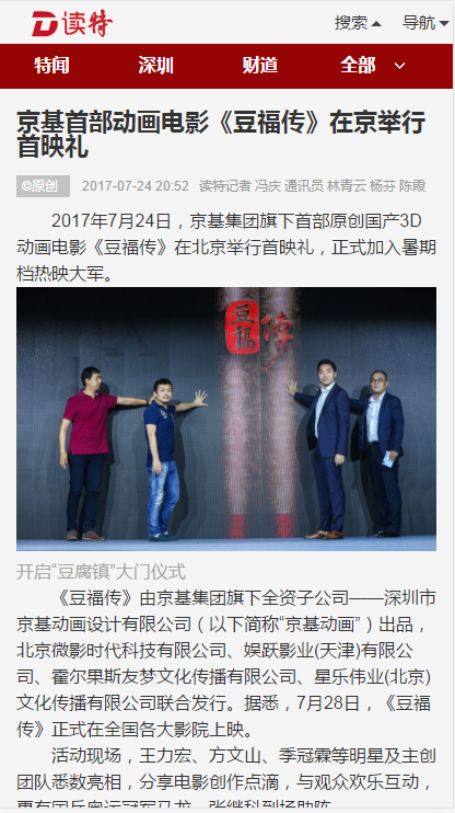 2017年7月24日,京基集团旗下首部原创国产3D动画电影《豆福传》在北京举行首映礼,正式加入暑期档热映大军。