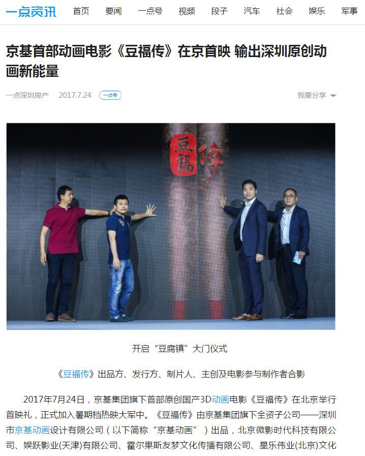 2017年7月24日,京基集团旗下首部原创国产3D动画电影《豆福传》在北京举行首映礼,正式加入暑期档热映大军中。《豆福传》由京基集团旗下全资子公司——深圳市京基动画设计有限公司(以下简称“京基动画”)出品,北京微影时代科技有限公司、娱跃影业(天津)有限公司、霍尔果斯友梦文化传播有限公司、星乐伟业(北京)文化传播有限公司联合发行。
