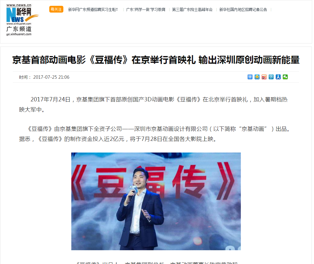 2017年7月24日,京基集团旗下首部原创国产3D动画电影《豆福传》在北京举行首映礼,加入暑期档热映大军中。