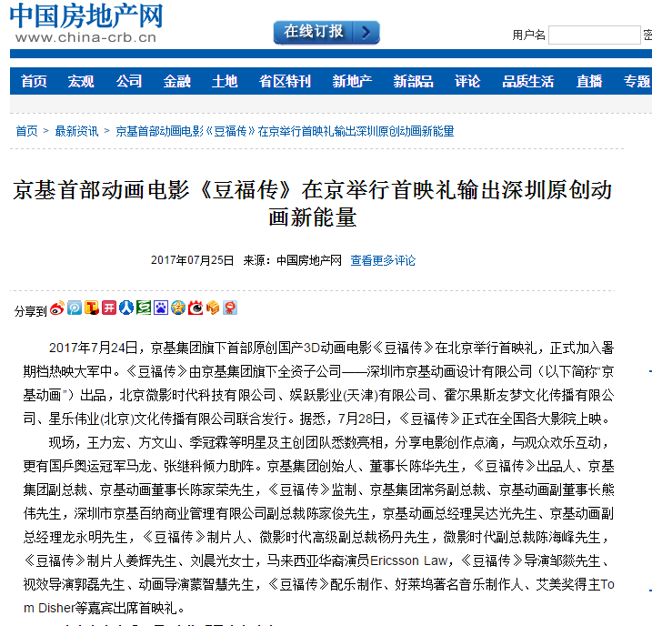 2017年7月24日,京基集团旗下首部原创国产3D动画电影《豆福传》在北京举行首映礼,正式加入暑期档热映大军中。《豆福传》由京基集团旗下全资子公司——深圳市京基动画设计有限公司(以下简称“京基动画”)出品,北京微影时代科技有限公司、娱跃影业(天津)有限公司、霍尔果斯友梦文化传播有限公司、星乐伟业(北京)文化传播有限公司联合发行。据悉,7月28日,《豆福传》正式在全国各大影院上映。