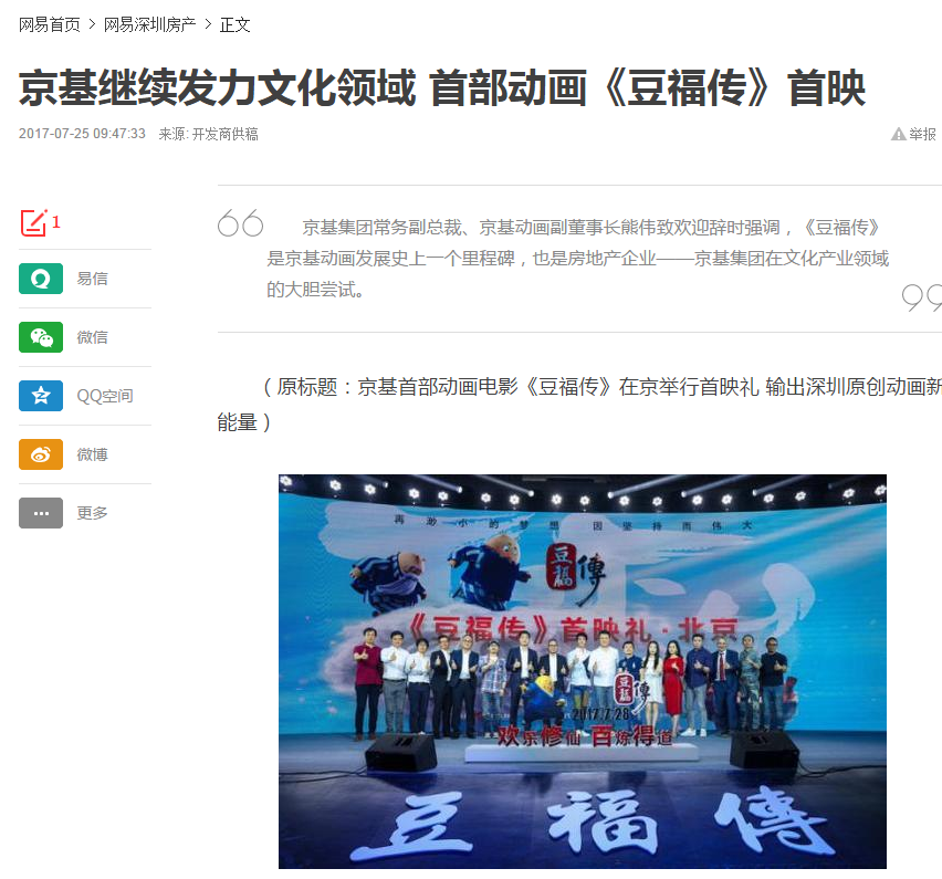 2017年7月24日,京基集团旗下首部原创国产3D动画电影《豆福传》在北京举行首映礼,正式加入暑期档热映大军中。《豆福传》由京基集团旗下全资子公司——深圳市京基动画设计有限公司(以下简称“京基动画”)出品,北京微影时代科技有限公司、娱跃影业(天津)有限公司、霍尔果斯友梦文化传播有限公司、星乐伟业(北京)文化传播有限公司联合发行。据悉,7月28日,《豆福传》正式在全国各大影院上映。