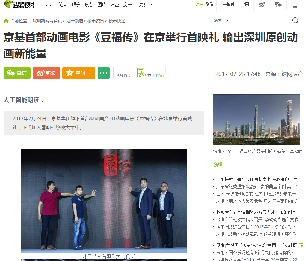 2017年7月24日,京基集团旗下首部原创国产3D动画电影《豆福传》在北京举行首映礼,正式加入暑期档热映大军中。《豆福传》由京基集团旗下全资子公司——深圳市京基动画设计有限公司(以下简称“京基动画”)出品,北京微影时代科技有限公司、娱跃影业(天津)有限公司、霍尔果斯友梦文化传播有限公司、星乐伟业(北京)文化传播有限公司联合发行。