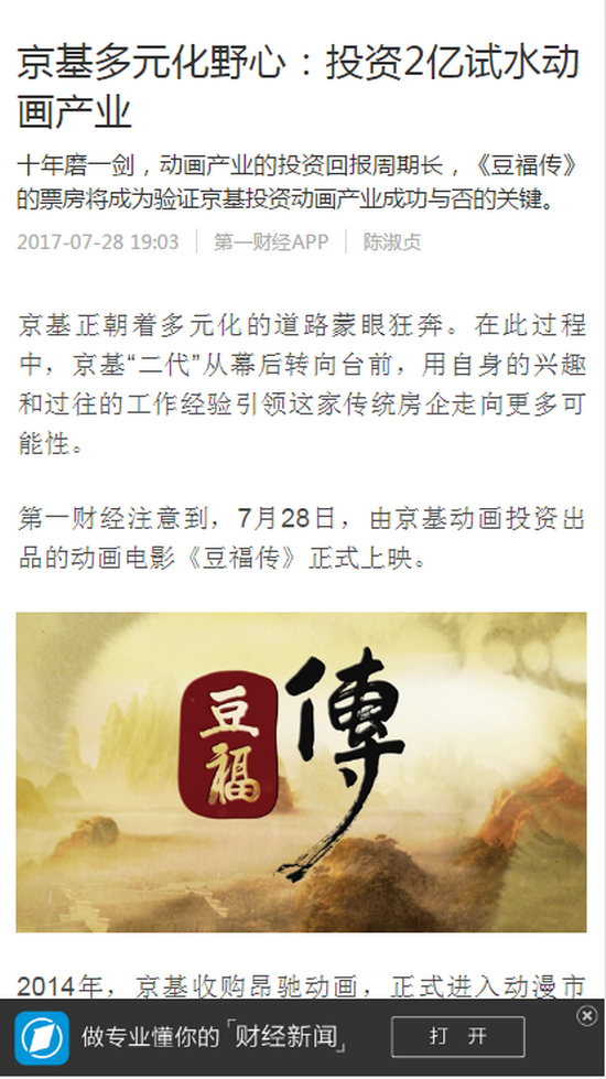 第一财经注意到,7月28日,由京基动画投资出品的动画电影《豆福传》正式上映。