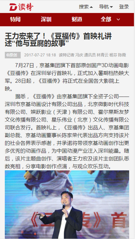 7月27日,京基集团旗下首部原创国产3D动画电影《豆福传》在深圳举行首映礼,正式加入暑期档热映大军。28日起,《豆福传》将正式在全国各大影院上映。