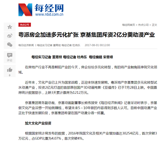近年来,文化产业已上升为国家战略,正迎来快速发展期。粤派地产京基集团多元化转型试水动漫产业,投资2亿元打造的首部原创国产3D动画电影《豆福传》已于7月28日上映。中国票房统计数据显示,上映3天累计票房为1212万元。