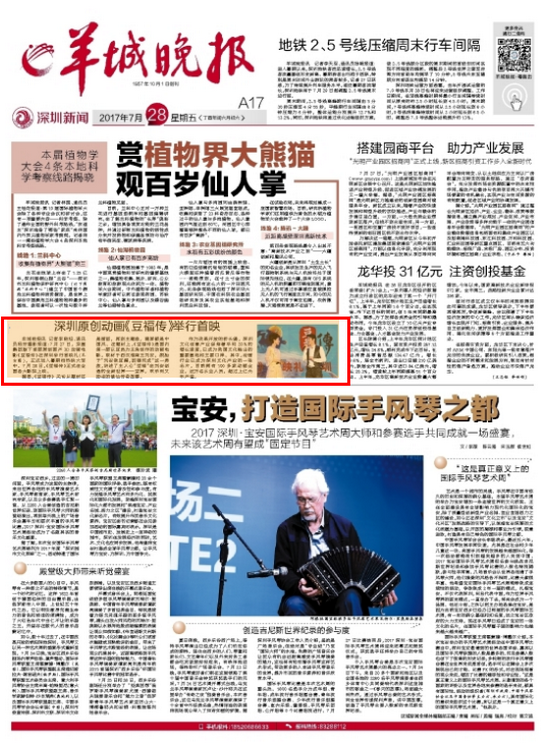 羊城晚报讯记者李晓旭、通讯员杨芬摄影报道:7月27日,京基集团旗下首部原创国产3D动画电影《豆福传》在深圳举行首映礼(见右图),正式加入暑期档热映大军中。7月28日,《豆福传》正式在全国各大影院上映。