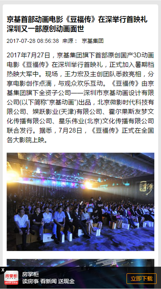 2017年7月27日,京基集团旗下首部原创国产3D动画电影《豆福传》在深圳举行首映礼,正式加入暑期档热映大军中。现场,王力宏及主创团队悉数亮相,分享电影创作点滴,与观众欢乐互动。《豆福传》由京基集团旗下全资子公司——深圳市京基动画设计有限公司(以下简称“京基动画”)出品,北京微影时代科技有限公司、娱跃影业(天津)有限公司、霍尔果斯友梦文化传播有限公司、星乐伟业(北京)文化传播有限公司联合发行。据悉,7月28日,《豆福传》正式在全国各大影院上映。