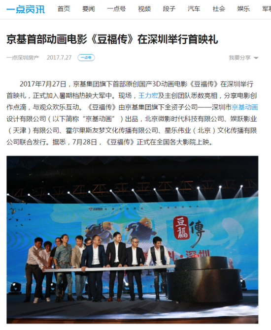 2017年7月27日,京基集团旗下首部原创国产3D动画电影《豆福传》在深圳举行首映礼,正式加入暑期档热映大军中。现场,王力宏及主创团队悉数亮相,分享电影创作点滴,与观众欢乐互动。《豆福传》由京基集团旗下全资子公司——深圳市京基动画设计有限公司(以下简称“京基动画”)出品,北京微影时代科技有限公司、娱跃影业(天津)有限公司、霍尔果斯友梦文化传播有限公司、星乐伟业(北京)文化传播有限公司联合发行。据悉,7月28日,《豆福传》正式在全国各大影院上映。
