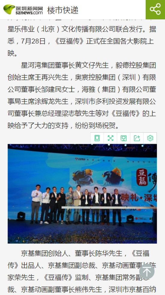 星河湾集团董事长黄文仔先生,毅德控股集团创始主席王再兴先生,奥宸控股集团(深圳)有限公司董事长邹建民女士,海雅(集团)有限公司董事局主席涂辉龙先生,深圳市多利投资发展有限公司董事长兼总经理梁志敏先生等对《豆福传》的上映给予了大力的支持,纷纷到场祝贺。
