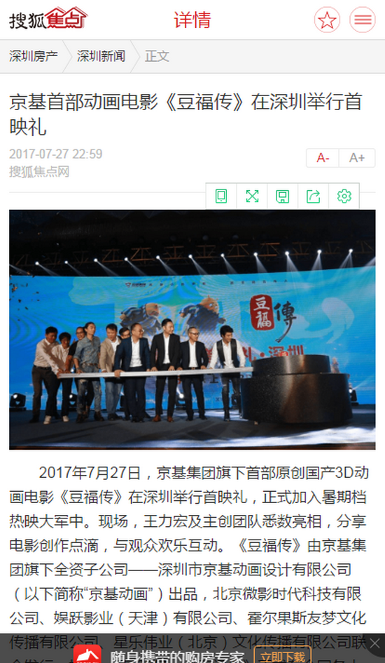 2017年7月27日,京基集团旗下首部原创国产3D动画电影《豆福传》在深圳举行首映礼,正式加入暑期档热映大军中。现场,王力宏及主创团队悉数亮相,分享电影创作点滴,与观众欢乐互动。《豆福传》由京基集团旗下全资子公司——深圳市京基动画设计有限公司(以下简称“京基动画”)出品,北京微影时代科技有限公司、娱跃影业(天津)有限公司、霍尔果斯友梦文化传播有限公司、星乐伟业(北京)文化传播有限公司联合发行。据悉,7月28日,《豆福传》正式在全国各大影院上映。