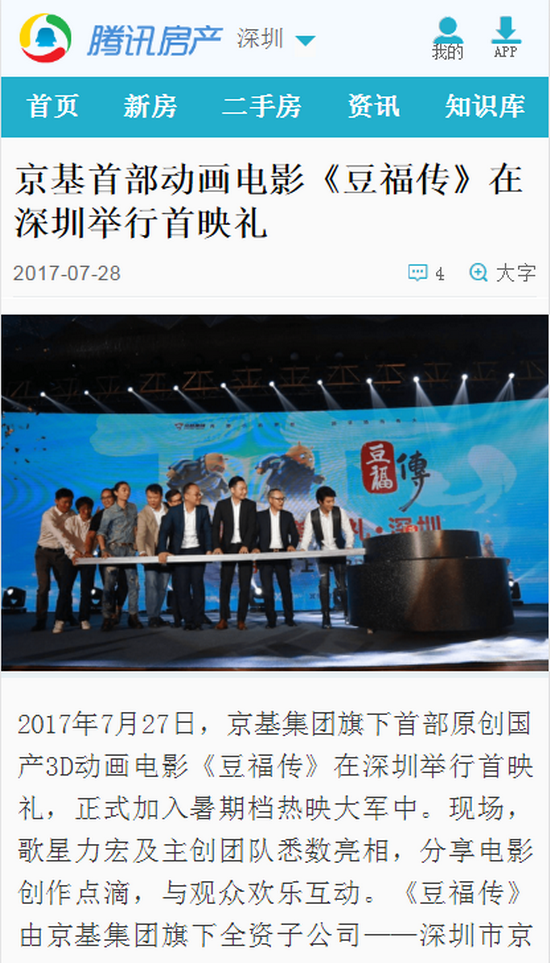 2017年7月27日,京基集团旗下首部原创国产3D动画电影《豆福传》在深圳举行首映礼,正式加入暑期档热映大军中。现场,歌星力宏及主创团队悉数亮相,分享电影创作点滴,与观众欢乐互动。《豆福传》由京基集团旗下全资子公司——深圳市京基动画设计有限公司(以下简称“京基动画”)出品,北京微影时代科技有限公司、娱跃影业(天津)有限公司、霍尔果斯友梦文化传播有限公司、星乐伟业(北京)文化传播有限公司联合发行。据悉,7月28日,《豆福传》正式在全国各大影院上映。
