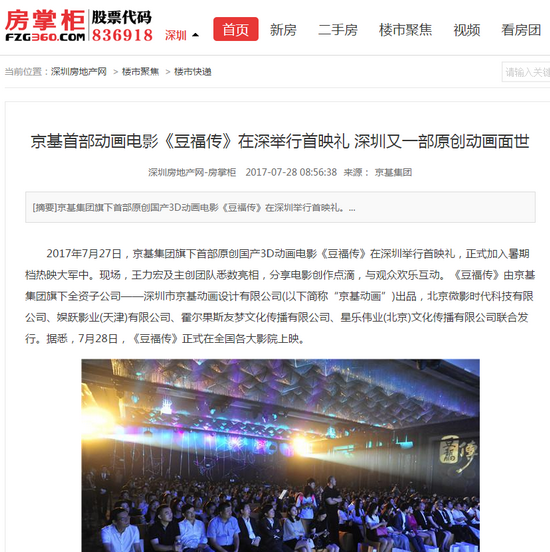2017年7月27日,京基集团旗下首部原创国产3D动画电影《豆福传》在深圳举行首映礼,正式加入暑期档热映大军中。现场,王力宏及主创团队悉数亮相,分享电影创作点滴,与观众欢乐互动。《豆福传》由京基集团旗下全资子公司——深圳市京基动画设计有限公司(以下简称“京基动画”)出品,北京微影时代科技有限公司、娱跃影业(天津)有限公司、霍尔果斯友梦文化传播有限公司、星乐伟业(北京)文化传播有限公司联合发行。据悉,7月28日,《豆福传》正式在全国各大影院上映。