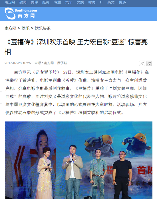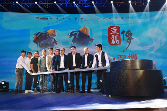 27日,深圳本土原创3D动画电影《豆福传》在深举行了首映礼,电影主题曲《听爱》作曲、演唱者王力宏与一众主创悉数亮相,分享电影电影幕后创作故事。《豆福传》脱胎于“刘安做豆腐,因错而成”的典故,同时刘安又是道家文化的代表性人物,影片将道家修仙文化与中国豆腐文化蕴含其中,以动画的形式展现在大家眼前。活动现场,片方便以推动石磨的形式完成了《豆福传》深圳首映礼的启动仪式。