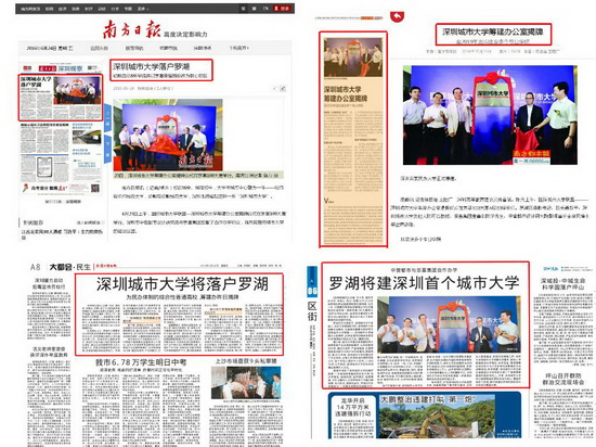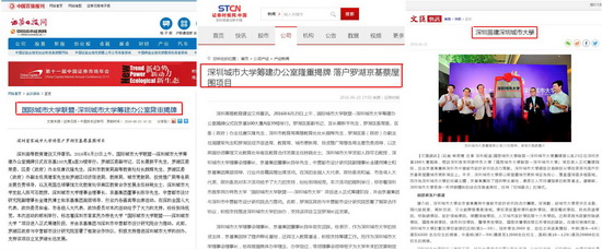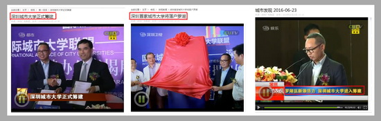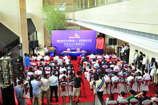 2016年6月23日上午,国际城市大学联盟--深圳城市大学筹建办公室揭牌仪式在京基100大厦A座39楼举行。罗湖区委副书记、区长聂新平先生,罗湖区委常委、区委(政府)办主任唐汉隆先生,深圳市教育局高等教育处处长颜辉先生,罗湖区委(政府)办副主任周建军先生和罗湖区经济促进局、教育局、城市更新局、投资推广局等各局主要负责领导,以及英国总领事馆文化教育处华南区教育合作发展主任林晓女士、深圳城市大学发起人陈可石教授,中营都市设计研究院副理事长金建民博士和深圳城市大学理事会理事长、京基集团董事长陈华先生,京基地产副董事长陈辉先生、京基集团副董事长王东河先生、常务副总裁熊伟先生、副总裁易文谦先生,京基地产常务副总裁杨玉雄先生、副总裁杜总,京基物业总经理李云常先生、京基百纳商业副总裁陈家俊先生等出席活动。在深的全国政协委员、省市各级人大代表、政协委员对本次活动给予了大力的支持,纷纷到场祝贺。现场还特邀了40多家省市级主流媒体,涵盖平面媒体、电视媒体、网络媒体、新媒体等多方位传播形式。
