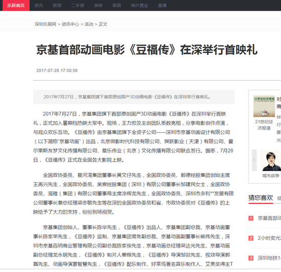 2017年7月27日,京基集团旗下首部原创国产3D动画电影《豆福传》在深圳举行首映礼,正式加入暑期档热映大军中。现场,王力宏及主创团队悉数亮相,分享电影创作点滴,与观众欢乐互动。《豆福传》由京基集团旗下全资子公司——深圳市京基动画设计有限公司(以下简称“京基动画”)出品,北京微影时代科技有限公司、娱跃影业(天津)有限公司、霍尔果斯友梦文化传播有限公司、星乐伟业(北京)文化传播有限公司联合发行。据悉,7月28日,《豆福传》正式在全国各大影院上映。