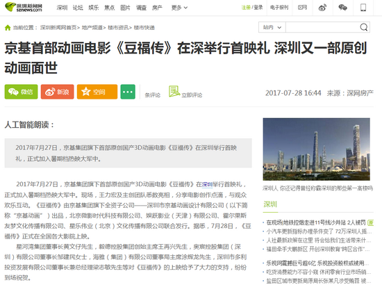 纵观2017年暑期档电影,动画电影占约13%,共12部,国产动画电影有9部,主要集中于7、8月上映。其中,由深圳公司独立出品的有2部,分别是《豆福传》和《玩偶奇兵》,均为原创动画IP。目前,深圳已经从最开始的“全球动漫加工基地”升级为“全国动漫网游创意基地”,完成了由“加工”向“原创”的转变。