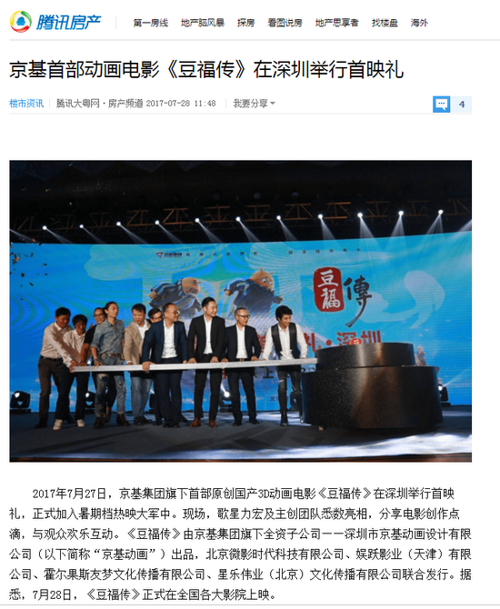 2017年7月27日,京基集团旗下首部原创国产3D动画电影《豆福传》在深圳举行首映礼,正式加入暑期档热映大军中。现场,歌星力宏及主创团队悉数亮相,分享电影创作点滴,与观众欢乐互动。《豆福传》由京基集团旗下全资子公司——深圳市京基动画设计有限公司(以下简称“京基动画”)出品,北京微影时代科技有限公司、娱跃影业(天津)有限公司、霍尔果斯友梦文化传播有限公司、星乐伟业(北京)文化传播有限公司联合发行。据悉,7月28日,《豆福传》正式在全国各大影院上映。
