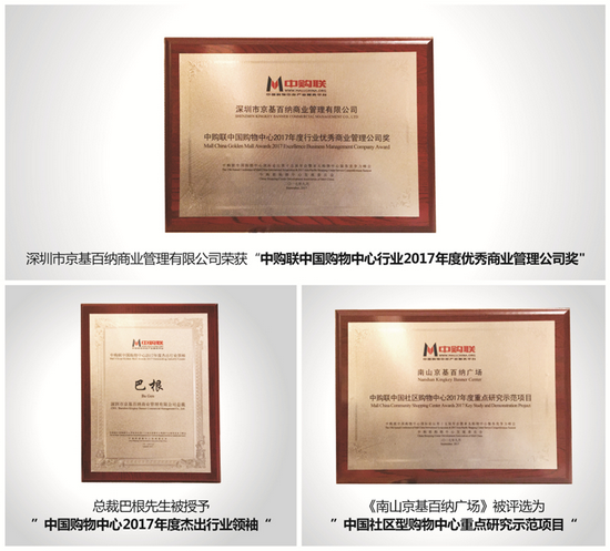 9月20日晚,中购联中国购物中心行业2017年度颁奖典礼揭幕,京基百纳凭借11年的商业运营管理积淀,荣获组委会颁获“中购联中国购物中心行业2017年度优秀商业管理公司奖”,京基百纳旗下首家购物中心南山京基百纳广场,距今走过9周年,几经蜕变与成长,被评选为“中国社区型购物中心重点研究示范项目”。京基百纳总裁巴根,其出色的管理能力被中购联授予“中国购物中心2017年度杰出行业领袖”荣誉称号。