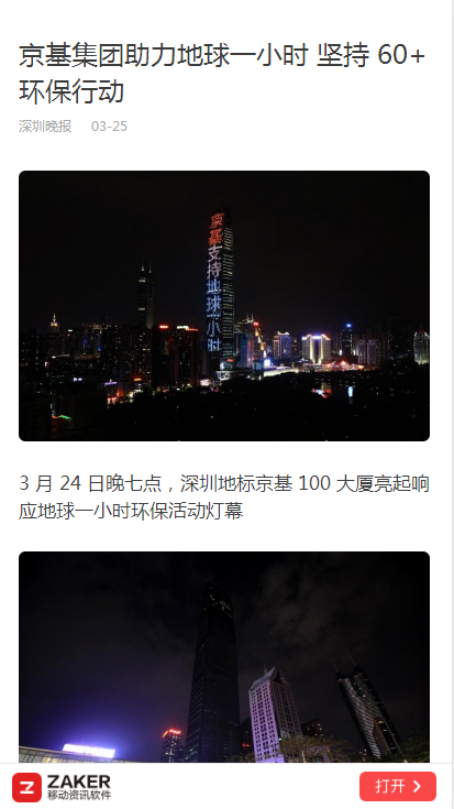 当晚,京基集团旗下京基100大厦、京基·滨河时代大厦、KKMALL、南山京基百纳广场、沙井京基百纳广场、KK ONE、深圳瑞吉酒店、京基晶都酒店、大梅沙京基喜来登度假酒店、京基海湾大酒店等写字楼、住宅、商场、酒店近30个项目,纷纷关闭建筑外墙及大部分公共区域的灯光一小时,且通过自有传播平台号召租户、住户及客户,一起加入这场全球性的环保运动,共同保护地球。