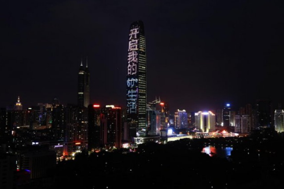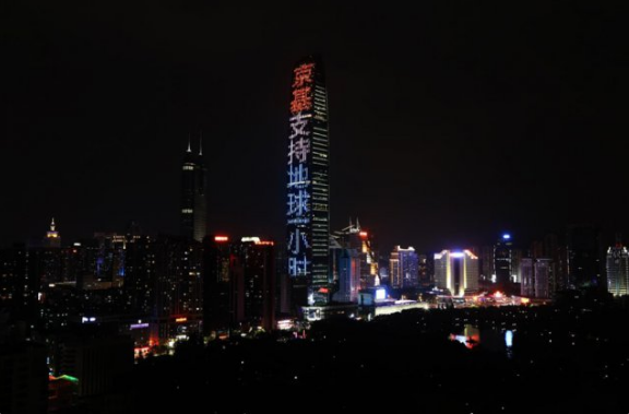 3月24日晚七点,深圳地标京基100大厦亮起响应地球一小时环保活动灯幕