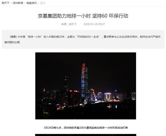当晚,京基集团旗下京基100大厦、京基·滨河时代大厦、KKMALL、南山京基百纳广场、沙井京基百纳广场、KK ONE、深圳瑞吉酒店、京基晶都酒店、大梅沙京基喜来登度假酒店、京基海湾大酒店等写字楼、住宅、商场、酒店近30个项目,纷纷关闭建筑外墙及大部分公共区域的灯光一小时,且通过自有传播平台号召租户、住户及客户,一起加入这场全球性的环保运动,共同保护地球。