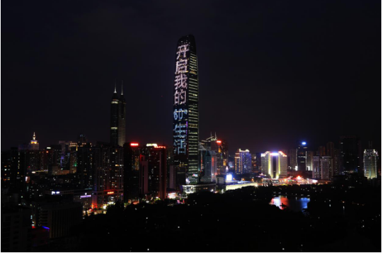 3月24日晚七点,深圳地标京基100大厦亮起响应地球一小时环保活动灯幕