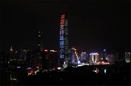 3月24日晚七点,深圳地标京基100大厦亮起响应地球一小时环保活动灯幕