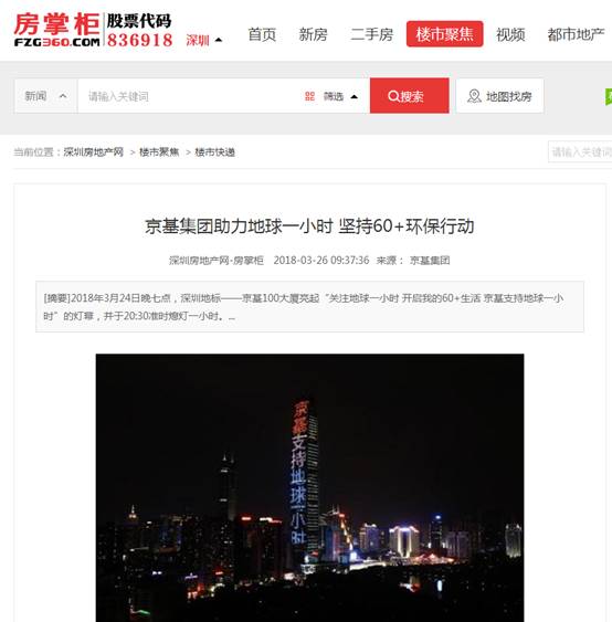 当晚,京基集团旗下京基100大厦、京基·滨河时代大厦、KK MALL、南山京基百纳广场、沙井京基百纳广场、KK ONE、深圳瑞吉酒店、京基晶都酒店、大梅沙京基喜来登度假酒店、京基海湾大酒店等写字楼、住宅、商场、酒店近30个项目,纷纷关闭建筑外墙及大部分公共区域的灯光一小时,且通过自有传播平台号召租户、住户及客户,一起加入这场全球性的环保运动,共同保护地球。