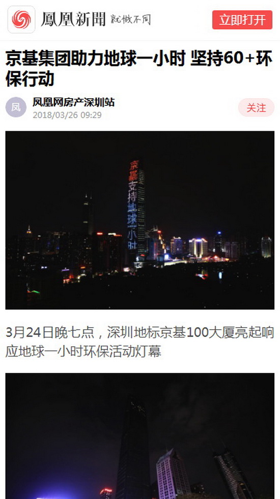 当晚,京基集团旗下京基100大厦、京基·滨河时代大厦、KK MALL、南山京基百纳广场、沙井京基百纳广场、KK ONE、深圳瑞吉酒店、京基晶都酒店、大梅沙京基喜来登度假酒店、京基海湾大酒店等写字楼、住宅、商场、酒店近30个项目,纷纷关闭建筑外墙及大部分公共区域的灯光一小时,且通过自有传播平台号召租户、住户及客户,一起加入这场全球性的环保运动,共同保护地球。