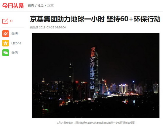 当晚,京基集团旗下京基100大厦、京基·滨河时代大厦、KK MALL、南山京基百纳广场、沙井京基百纳广场、KK ONE、深圳瑞吉酒店、京基晶都酒店、大梅沙京基喜来登度假酒店、京基海湾大酒店等写字楼、住宅、商场、酒店近30个项目,纷纷关闭建筑外墙及大部分公共区域的灯光一小时,且通过自有传播平台号召租户、住户及客户,一起加入这场全球性的环保运动,共同保护地球。