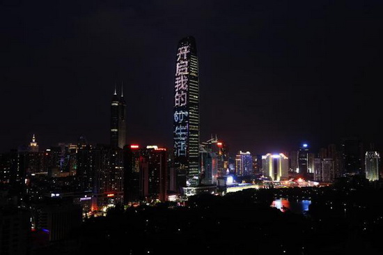 3月24日晚七点,深圳地标京基100大厦亮起响应地球一小时环保活动灯幕