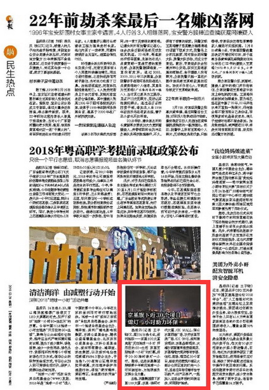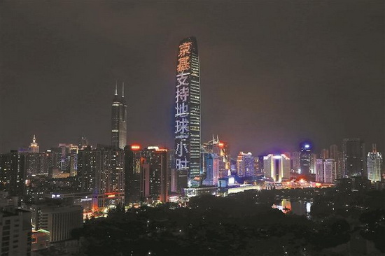 当晚,京基集团旗下京基100大厦、京基·滨河时代大厦、KK MALL、南山京基百纳广场、沙井京基百纳广场、KK ONE、深圳瑞吉酒店、京基晶都酒店、大梅沙京基喜来登度假酒店、京基海湾大酒店等写字楼、住宅、商场、酒店近30个项目,纷纷关闭建筑外墙及大部分公共区域的灯光一小时,且通过自有传播平台号召租户、住户及客户,一起加入这场全球性的环保运动,共同保护地球。