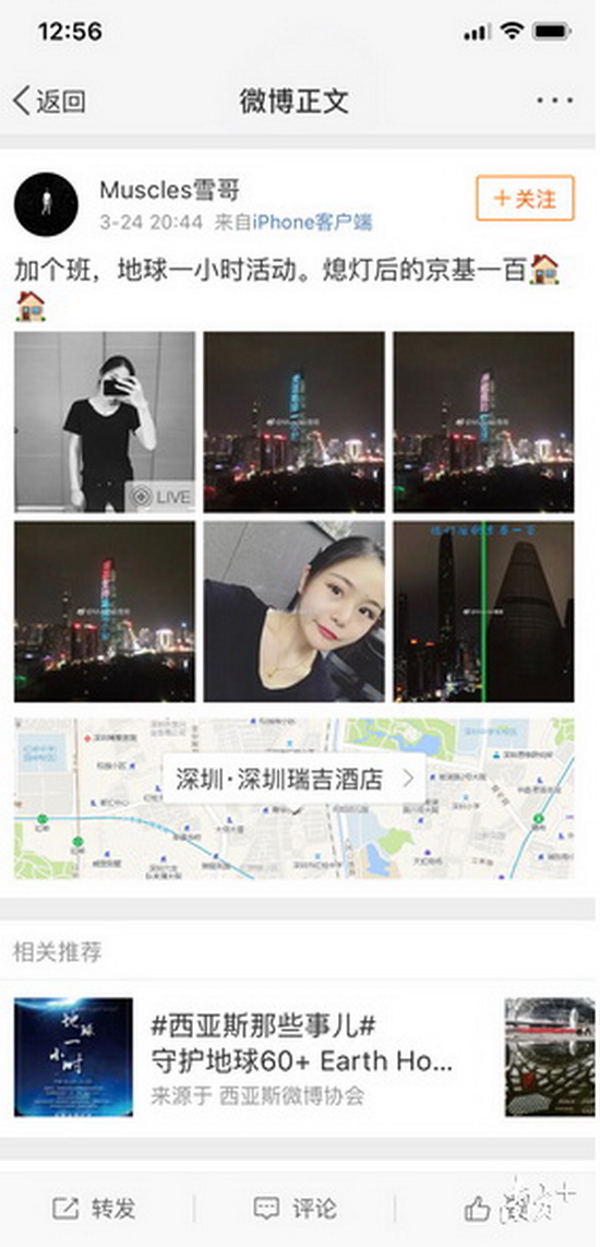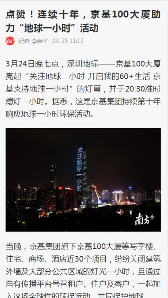 当晚,京基集团旗下京基100大厦等写字楼、住宅、商场、酒店近30个项目,纷纷关闭建筑外墙及大部分公共区域的灯光一小时,且通过自有传播平台号召租户、住户及客户,一起加入这场全球性的环保运动,共同保护地球。