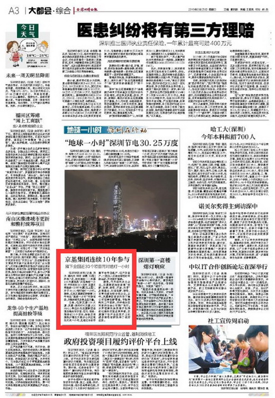 当晚,包括京基100大厦、京基·滨河时代大厦、KK MALL等在内的京基集团全国各地的写字楼、住宅、商场、酒店近30个项目,纷纷关闭建筑外墙及大部分公共区域的灯光一小时,且通过自有传播平台号召租户、住户及客户,一起加入这场全球性的环保运动,共同保护地球。
