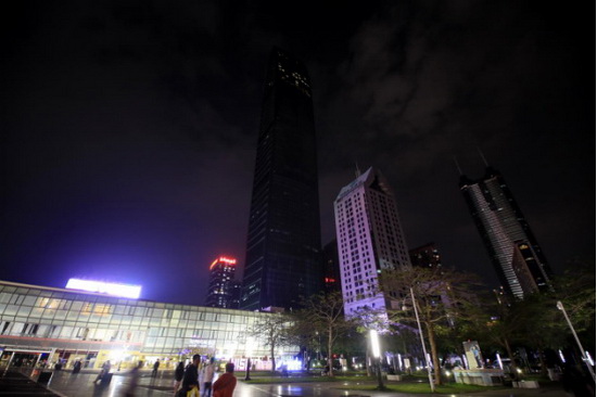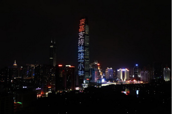 3月24日晚七点,深圳地标京基100大厦亮起响应地球一小时环保活动灯幕