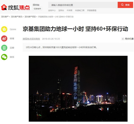 当晚,京基集团旗下京基100大厦、京基·滨河时代大厦、KK MALL、南山京基百纳广场、沙井京基百纳广场、KK ONE、深圳瑞吉酒店、京基晶都酒店、大梅沙京基喜来登度假酒店、京基海湾大酒店等写字楼、住宅、商场、酒店近30个项目,纷纷关闭建筑外墙及大部分公共区域的灯光一小时,且通过自有传播平台号召租户、住户及客户,一起加入这场全球性的环保运动,共同保护地球。