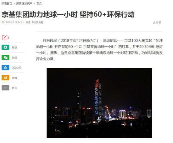 当晚,京基集团旗下京基100大厦、京基·滨河时代大厦、KK MALL、南山京基百纳广场、沙井京基百纳广场、KK ONE、深圳瑞吉酒店、京基晶都酒店、大梅沙京基喜来登度假酒店、京基海湾大酒店等写字楼、住宅、商场、酒店近30个项目,纷纷关闭建筑外墙及大部分公共区域的灯光一小时,且通过自有传播平台号召租户、住户及客户,一起加入这场全球性的环保运动,共同保护地球。
