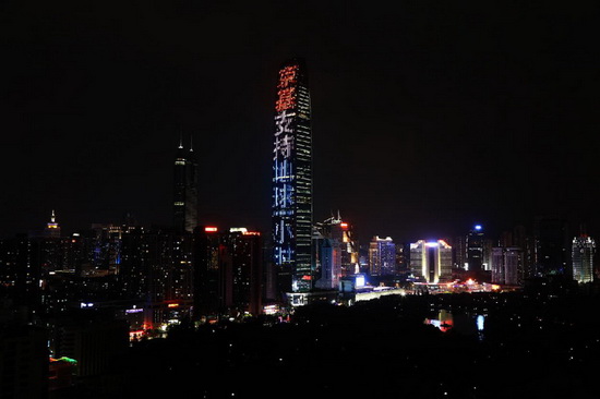 24日晚,深圳地标京基100大厦亮起响应“地球一小时”活动灯幕。