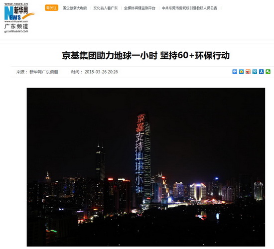 当晚,京基集团旗下京基100大厦、京基·滨河时代大厦、南山京基百纳广场、深圳瑞吉酒店、京基晶都酒店、大梅沙京基喜来登度假酒店、京基海湾大酒店等写字楼、住宅、商场、酒店近30个项目,纷纷关闭建筑外墙及大部分公共区域的灯光,且通过自有传播平台号召租户、住户及客户,一起加入这场环保运动,共同保护地球。