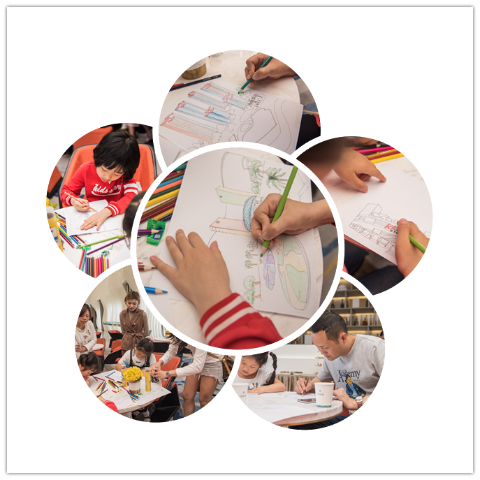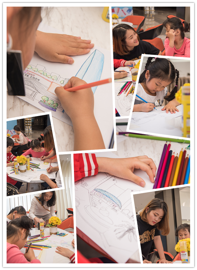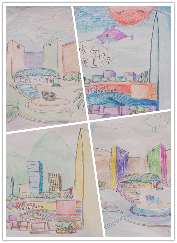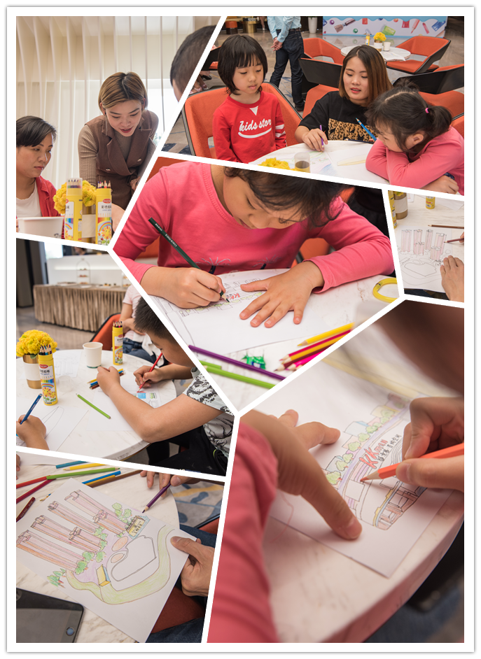 样板房参观结束后,大家陆续回到展示大厅,有的会员继续向销售人员咨询项目的情况,其余的会员在老师的带领下开始涂鸦DIY。在考虑到会员们绘画基础不统一和活动时间不宜太长的因素后,本次活动我们请老师提前分别将京基100、京基·御景峯、KK MALL、大梅沙京基喜来登酒店的轮廓完成,将大片空白部分留下来让大家自由发挥。在老师的细心指导下,大家认真仔细地在画纸上涂画,有的将京基100大厦涂成喜欢的黄色,有的将KK MALL画上五彩缤纷的颜色。小朋友们画得不亦乐乎,在一旁的家长不禁技痒,纷纷加入和孩子一起涂鸦。来自御景华城的杨心怡小朋友在天空中画上自己喜爱的海豚,当她的妈妈责怪她海豚应该生活在水里时,她说道:“我画的是我的世界,我的世界里海豚就是在天上生活。”这番话让周围的大伙儿莞尔一笑,给她的创造力和想象力点赞!