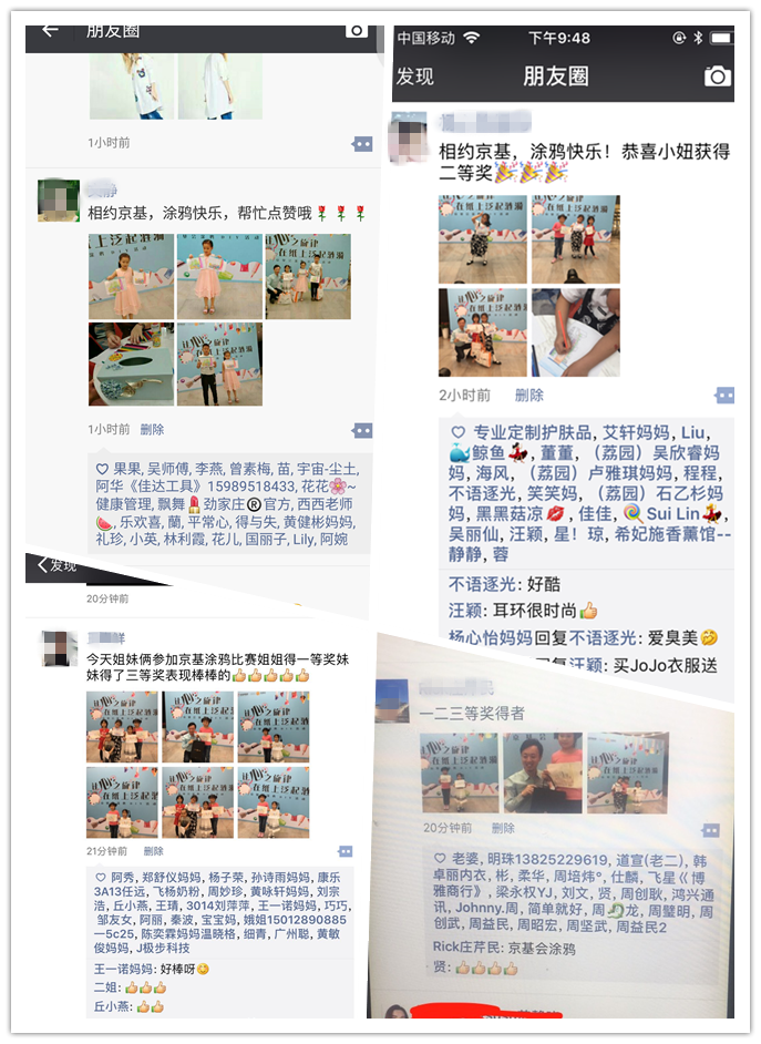 等到大家都完成涂鸦作品后,我们为大家的作品一一拍照留底,并请老师分别评选出一、二、三等奖,在大家的掌声中为获奖小作者送上一份小奖品,家长们纷纷举起手机拍下这个美好的时刻,活动在欢笑声中圆满完成。活动结束后在我们的鼓励下,许多家庭在微信朋友圈中分享了本次活动的照片,吸引了大量亲朋好友前来评论和点赞。